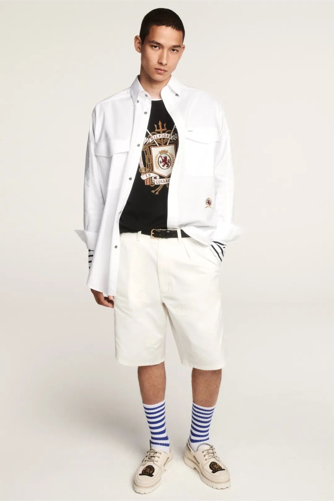 考虑到天气,短裤是平衡风度与温度的下装选择。卫衣与短裤都选择干净的纯色系,脚下再配双匡威或New Balance,就非常典型的city boy了。